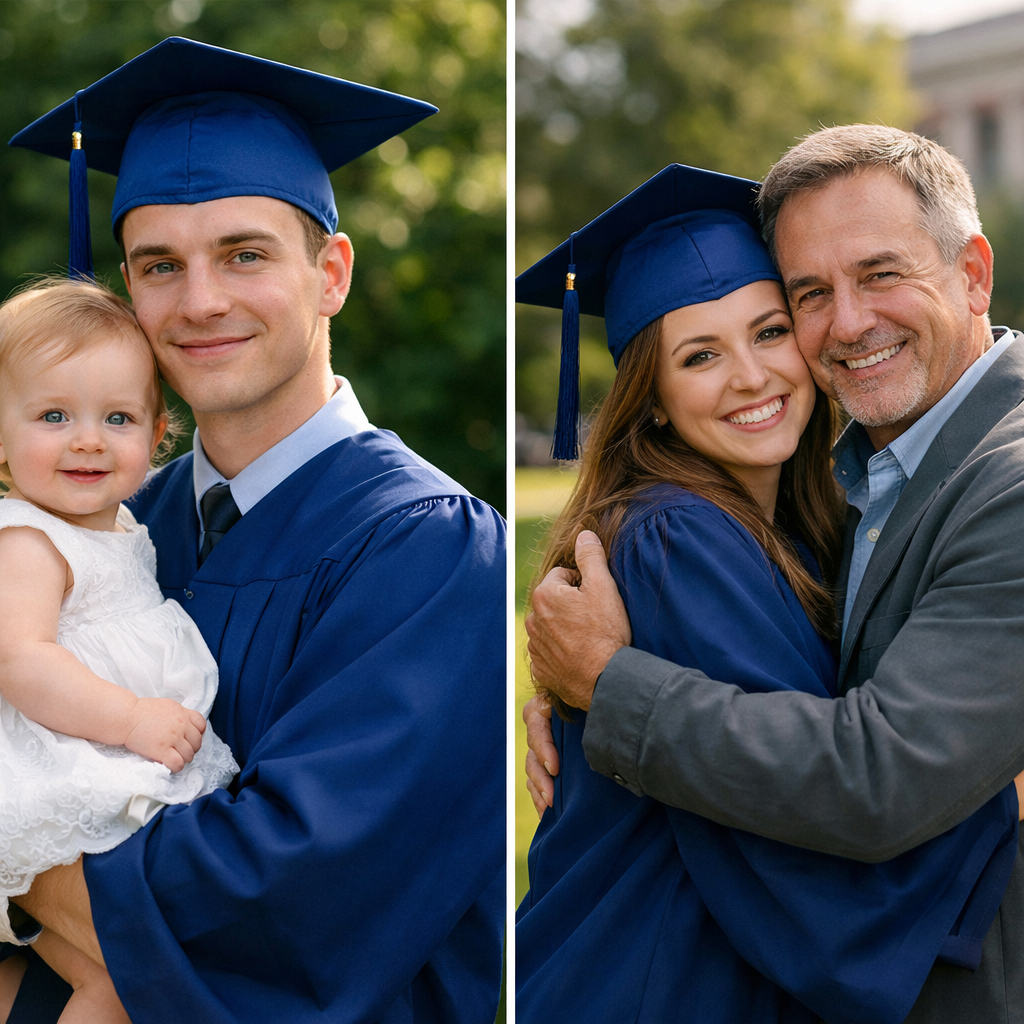 Между складками пледа лежала записка. Две строчки. «Она твоя. Я не могу с этим справиться». Всё. Ни подписи, ни объяснений, ни просьбы о прощении. Только ребёнок в корзине велосипеда и несколько слов, которые в одну минуту перевернули чужую жизнь. Папа говорил, что в ту ночь не понимал, кому звонить первым и что вообще делать. Он был семнадцатилетним парнем после смены, без опыта, без поддержки, без плана. В доме спал хмурый дядя, которому он не доверял ни себя, ни тем более младенца. Полиция, соцслужбы, соседи, больница — вариантов в голове мелькало много, но ни один не казался настоящим. И тогда он сделал самое простое и самое важное: прижал меня к себе. Потом покормил, как сумел. Потом почти не сомкнул глаз. А утром, когда другие выпускники поправляли галстуки и искали цветы для фотографий, он надел мантию, взял меня на руки и пошёл на свою церемонию вместе со мной.